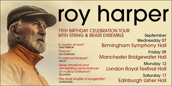 Celebrated singer-songwriter Roy Harper, embarks on 4 live dates in the UK to celebrate his 75th birthday this September. With a string and brass ensemble he plays Birmingham, Manchester, Edinburgh and London.